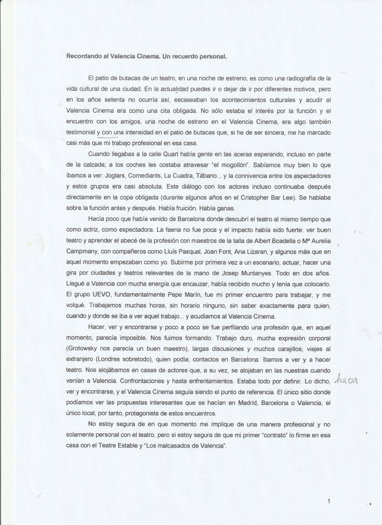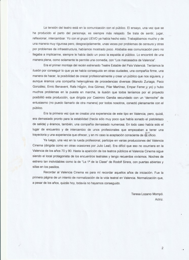 RECORDANDO AL VALENCIA CINEMA. UN RECUERDO PERSONAL. TERESA LOZANO MOMPÓ, ACTRIZ.